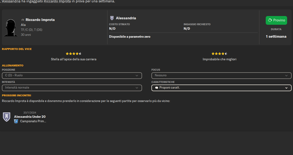 Improta, ex Benevento che tutti conoscerete, farà una settimana di prova all'Alessandria, è svincolato e, dunque, alla fine del periodo di prova potrebbe essere ingaggiato.